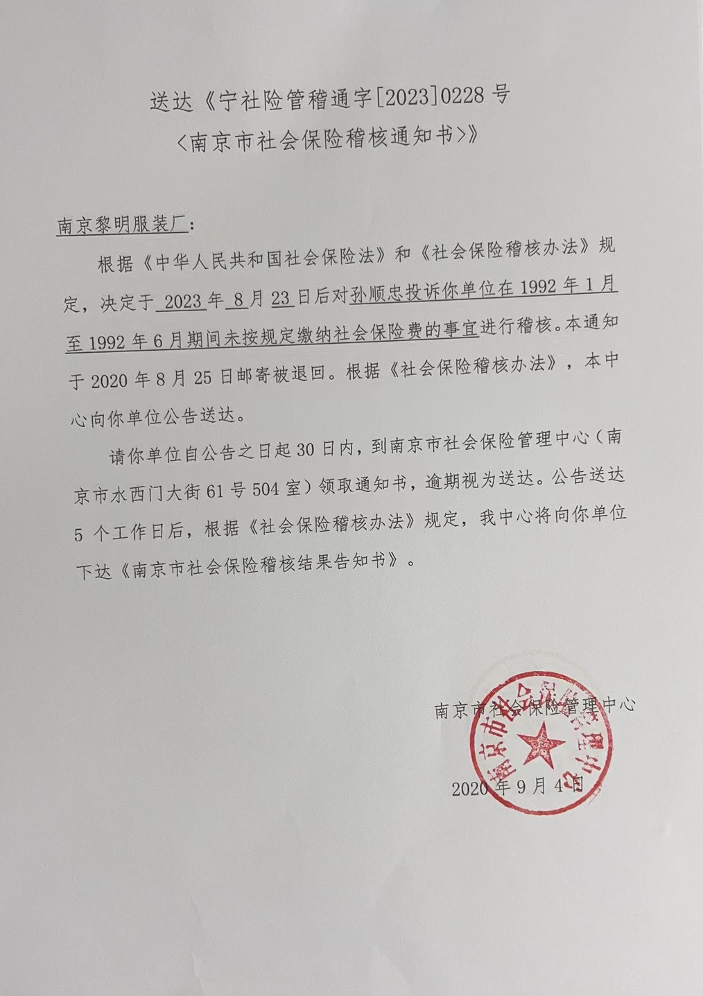 送达《宁社险管稽通字〔2023〕0228号<南京市社会保险稽核通知书>》(南京黎明服装厂)