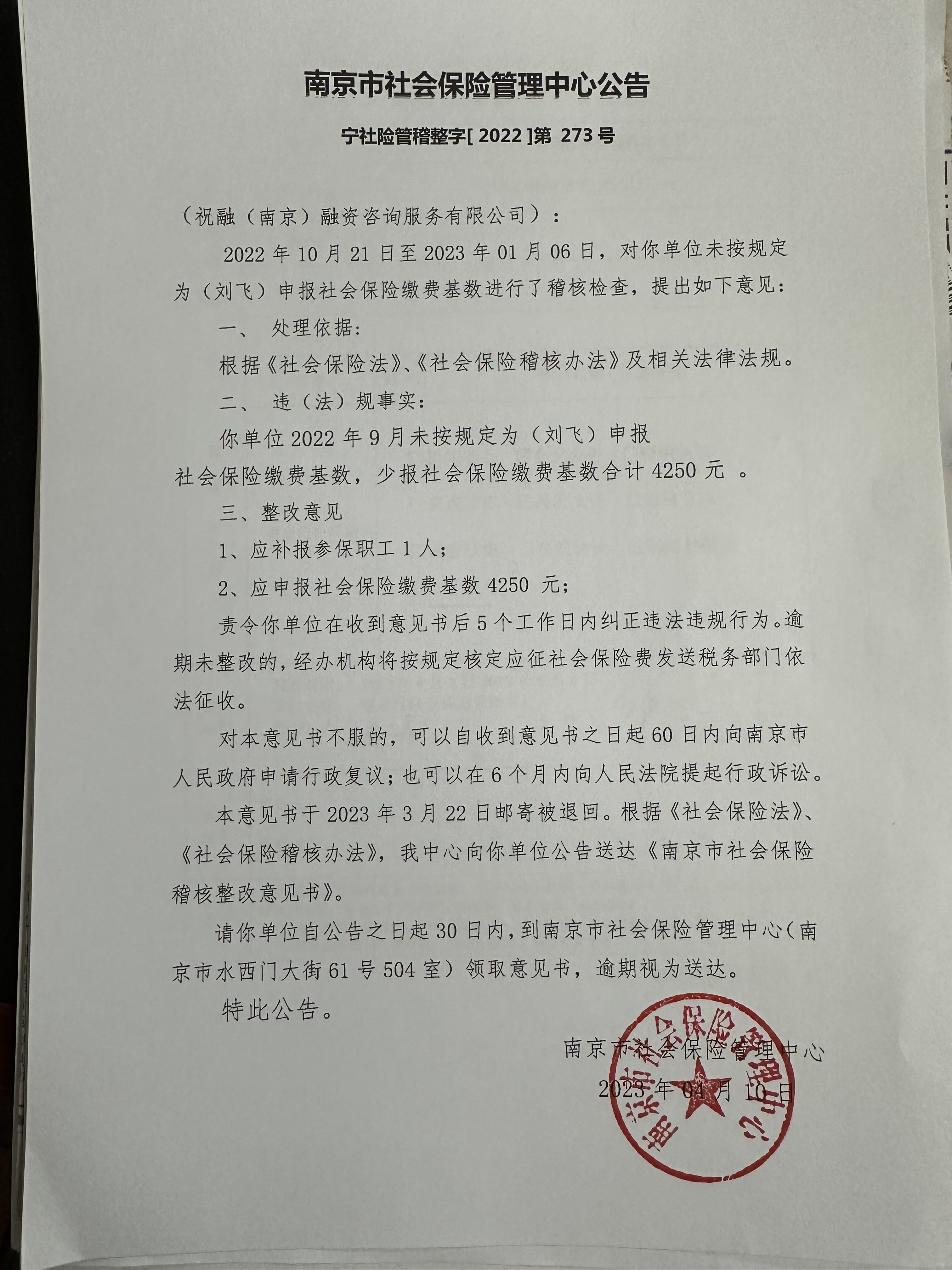 点击查看:南京市社会保险管理中心公告(祝融(南京)融资咨询服务有限公司)