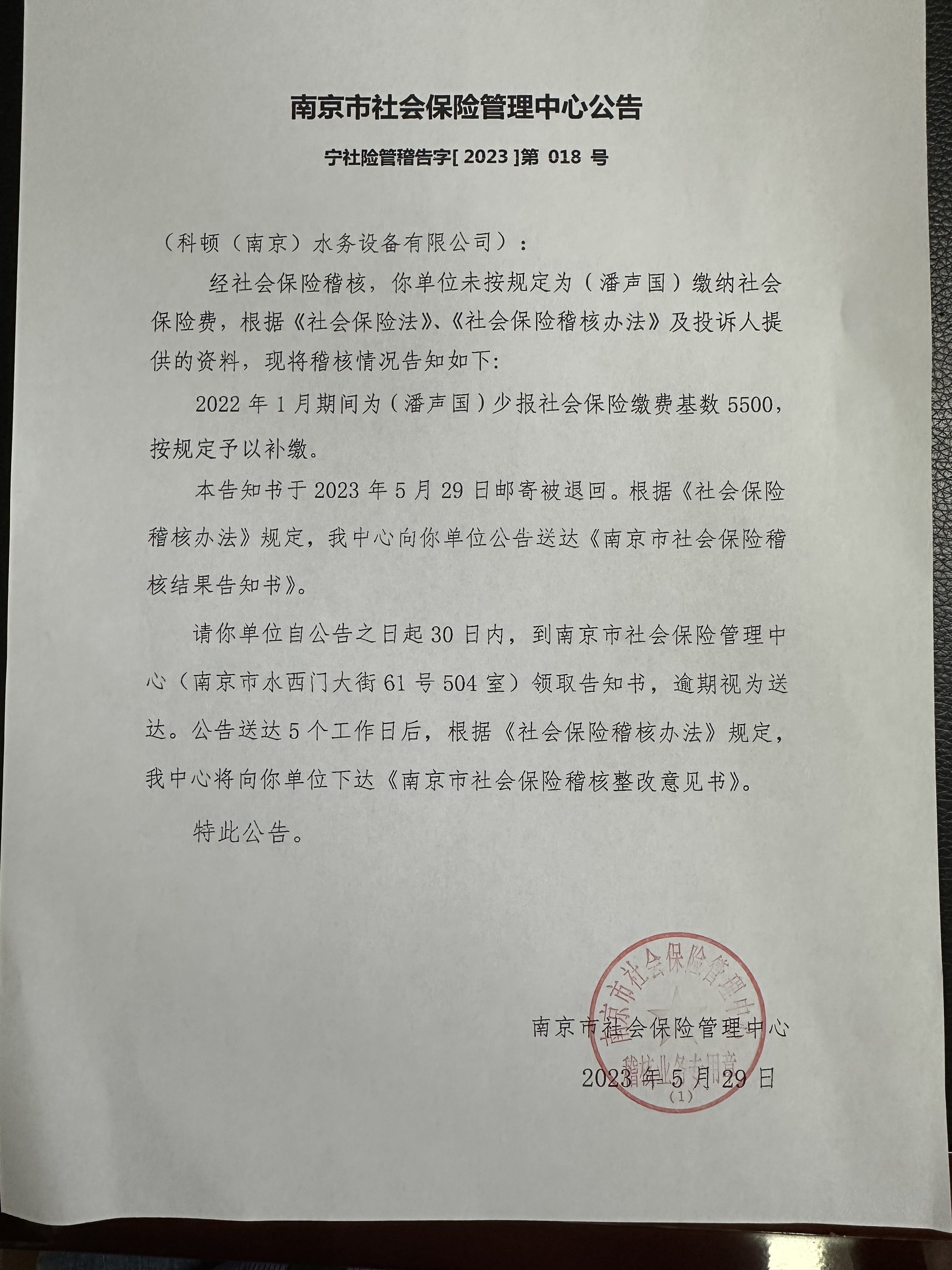 南京市社会保险管理中心公告(科顿(南京)水务设备有限公司)