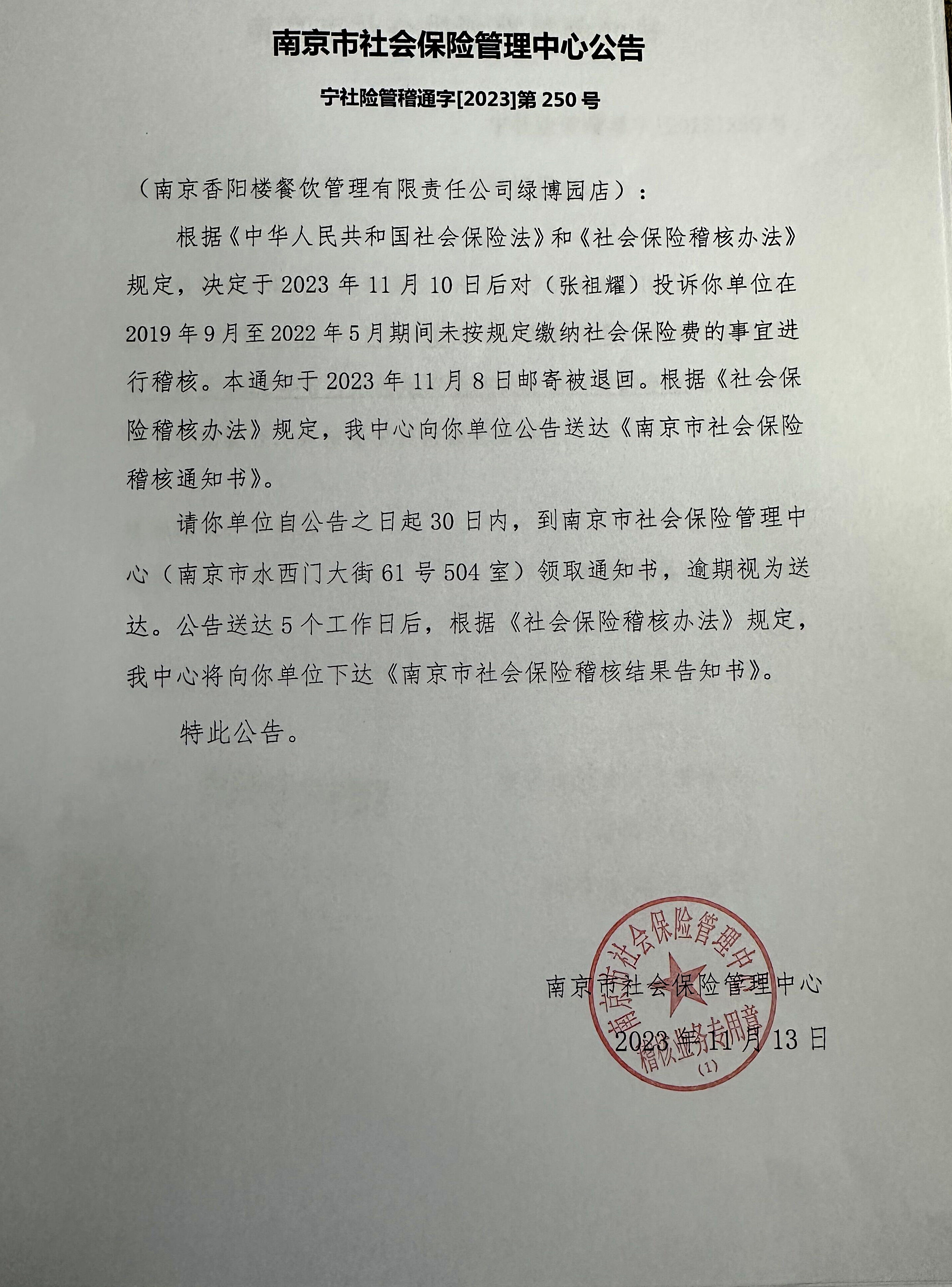 南京市社会保险管理中心公告(南京香阳楼餐饮管理有限责任公司绿博园店)