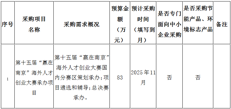 政府采购意向公告(第十五届“赢在南京”海外人才创业大赛承办项目)