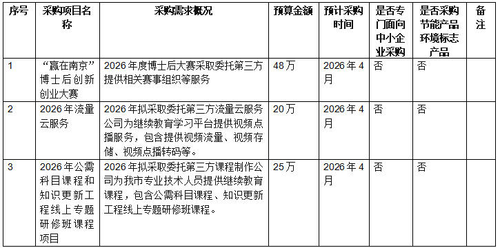 | 信息名称: | 政府采购意向公开(“赢在南京”博士后创新创业大赛等) | ||