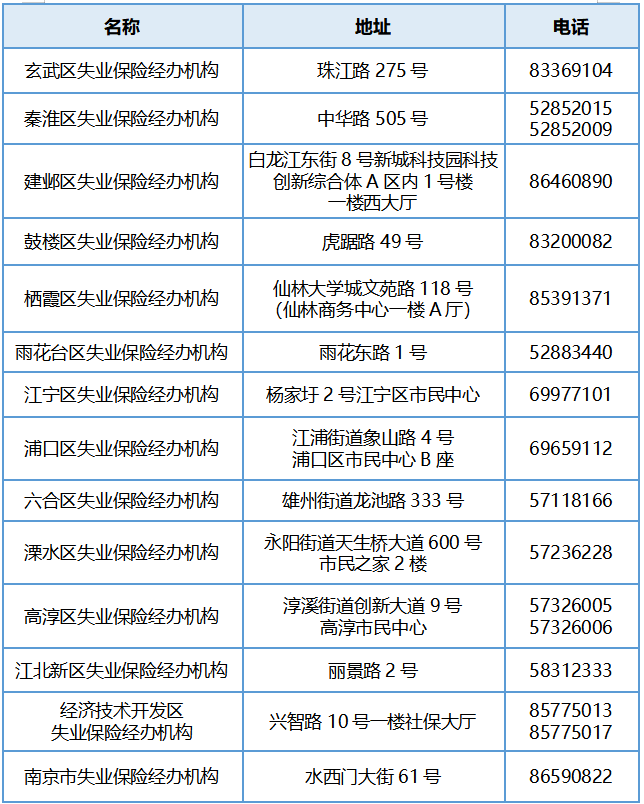 南京市、区失业保险经办机构联系方式(一次性扩岗补助)