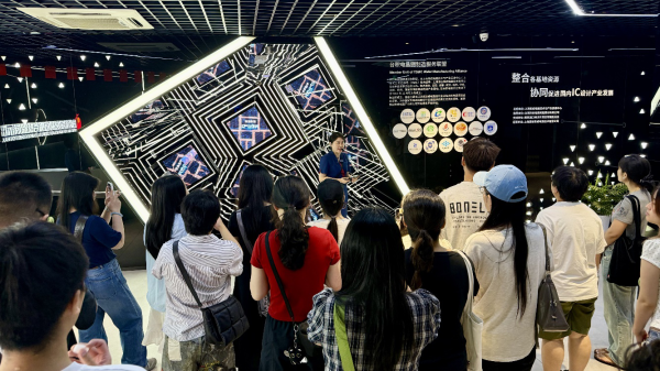 该试验区是首批国家级、全省唯一民用无人机试验区,汇聚众多顶尖科研人才,吸引众多行业佼佼者前来投资兴业,承担着探索无人驾驶航空技术、推动产业创新发展的重任,着力构建“两平台四空域多场区”产业格局,推动“5G+无人机”应用,已经形成辐射效应,成为推动区域经济腾飞的新引擎。在现场,大家认真聆听工作人员的详细介绍,通过实时监控系统观摩无人机低空作业演示,深刻领略到了科技前沿的独特魅力。随后,一行人转场至南京集成电路创新馆观摩集成电路发展历程,AR技术与机械臂演示让抽象的IC技术变得可感可触。在台积电晶圆制造服务联盟展示区,大家沿着芯片设计、晶圆制造、测试封装的全产业环依次参观,通过互动装置亲手操作芯片测试流程、触摸科技温度,直观理解“从沙粒到芯片”的精密转化。一些曾从事半导体研究的海归人才驻足良久,与工作人员深入探讨先进制程技术,现场交流气氛热烈,创新灵感奔涌不息。