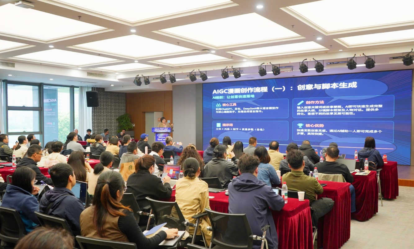 培训紧密贴合数字经济发展与职场实际需求,设置AI战略认知与工具入门、AI数据处理与PPT制作、AIGC动画漫画及IP打造、动态海报与视觉短片生成四门核心课程,构建从基础认知到创意实践的完整教学体系。授课讲师均来自行业一线,采用理论讲解+案例演示+现场实操的沉浸式教学模式,突出即学即用、学以致用。课堂上,不少零基础学员快速掌握操作技巧,当堂完成专属IP形象、动态海报、AI视频等原创作品,真正实现“上午学理论、下午出作品、学完就能用”。